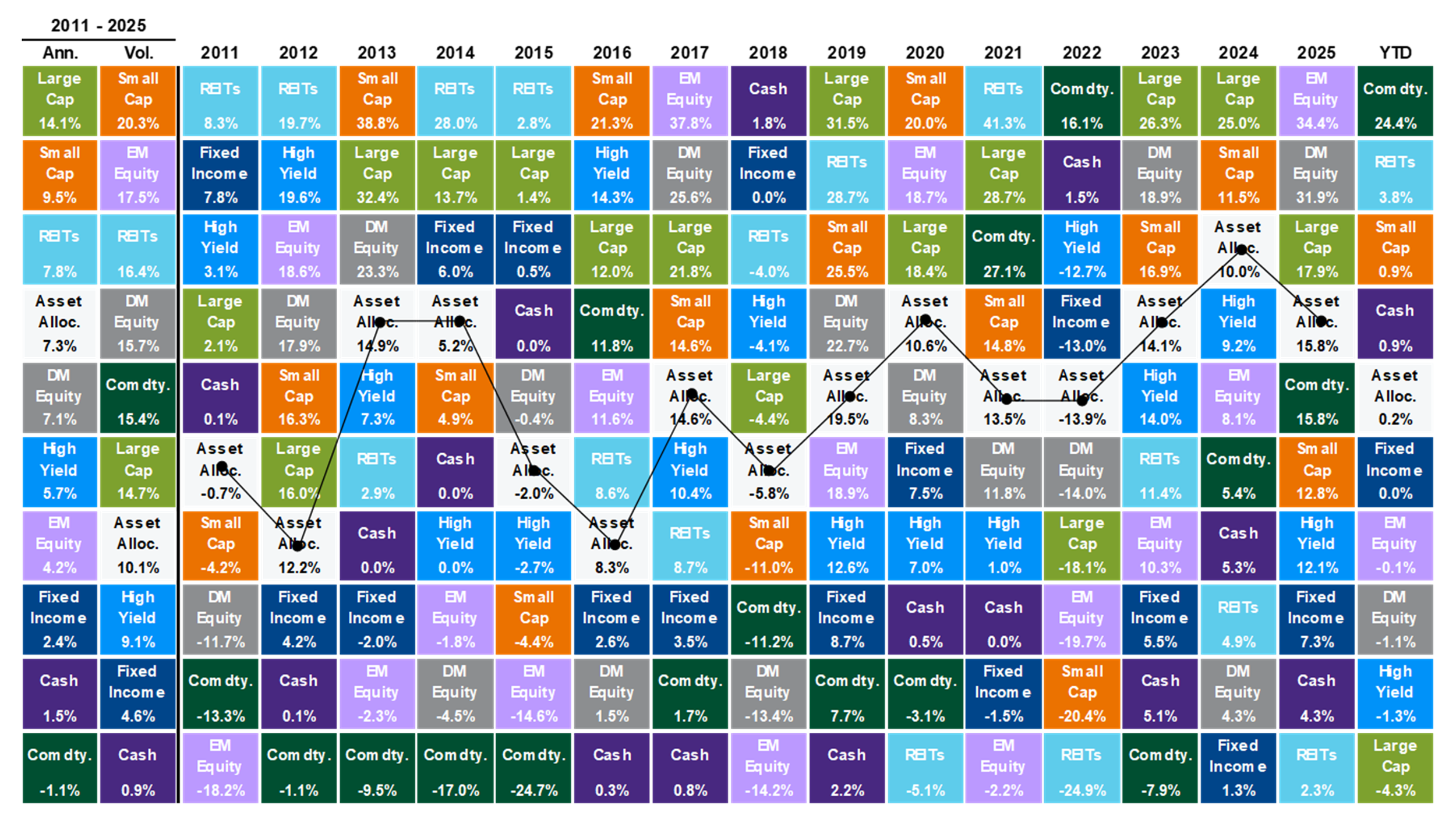 This chart shows annual returns by asset class from 2011 through 2025 (plus year-to-date), with each color representing a different asset category. The boxes are ranked each year from highest return at the top to lowest at the bottom, which highlights how market leadership changes over time. The black line tracks a diversified “asset allocation” portfolio, illustrating how diversification can help smooth returns compared with any single asset class.