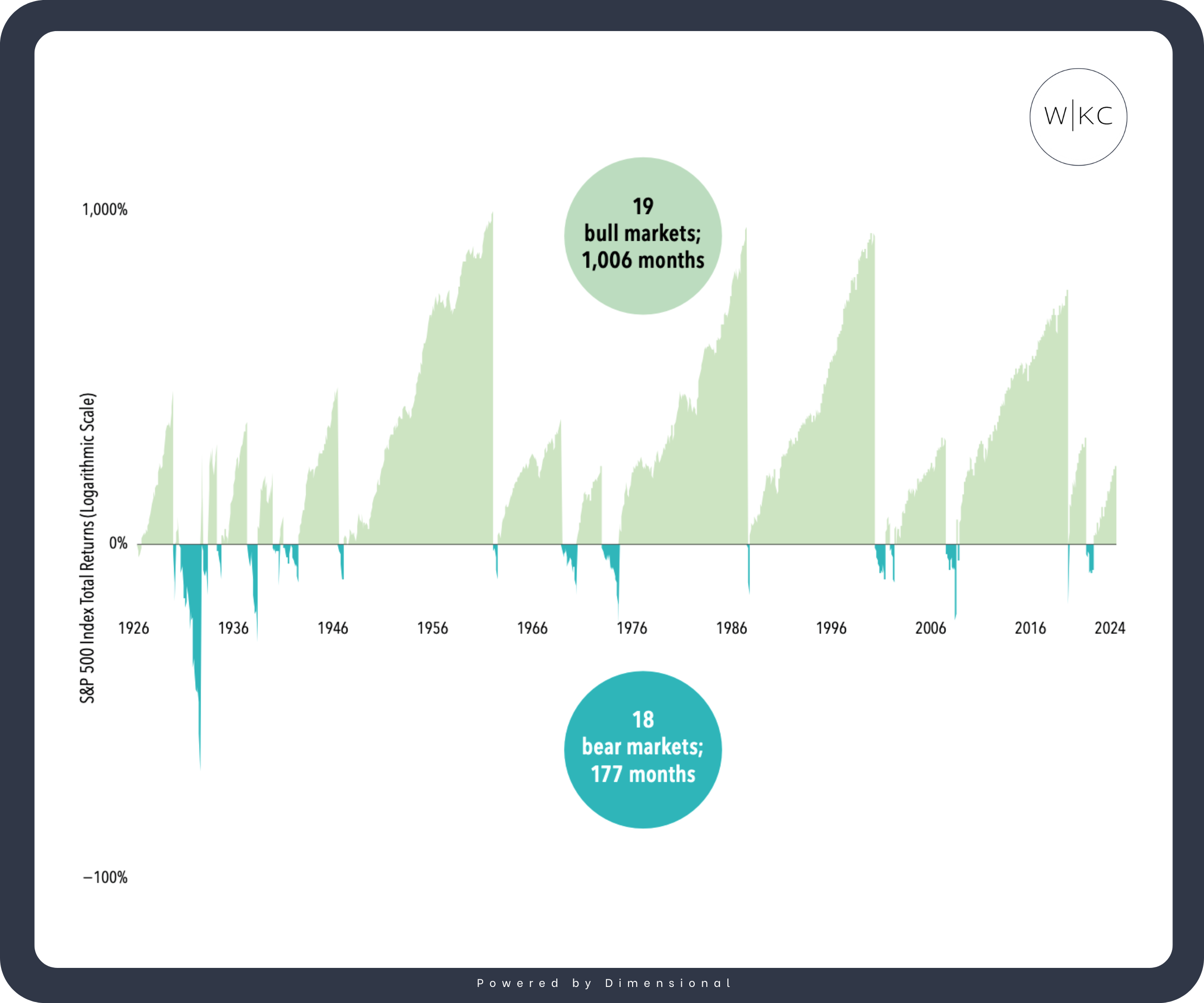 At Wealth|KC, we know that market volatility can be unsettling. When headlines scream about downturns and corrections, it's natural to feel uneasy. But here’s the truth backed by nearly 100 years of history: the market rewards patience.