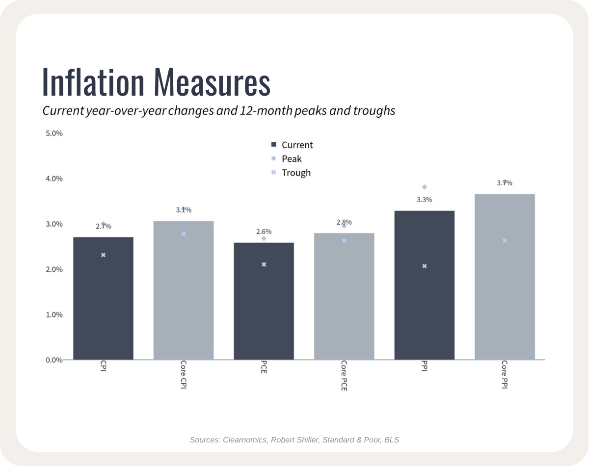 The Consumer Price Index paints a slightly calmer picture but still shows inflation holding firm. Headline inflation rose 2.7% over the past year, or 3.1% when excluding food and energy, which have been relatively flat. Much of this stickiness is tied to shelter costs, especially housing.